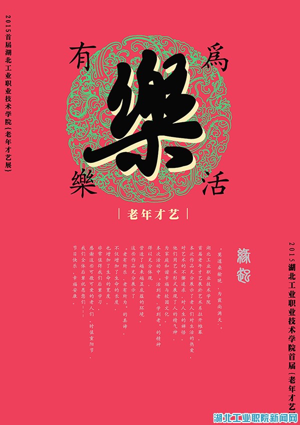 为了进一步丰富我院退休职工的退休生活,体现我院退休职工的风采与活力,展示大家的才艺。退休教工服务中心举办的首届退休教工才艺展将于2015年10月21日上午9:30在艺术设计系二楼展厅开幕,展览将展出一周,届时特邀全院师生前往观展。