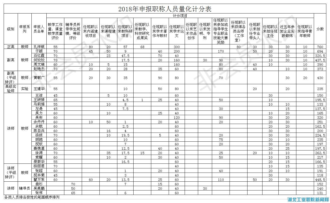 根据《湖北工业职业技术学院专业技术职务任职资格评审办法(试行)》、《湖北工业职业技术学院职称评审量化计分办法(修订)》文件规定,学院职改办(人事处)组织相关职能部门进行量化评分核定,现将孔祥银等31位同志量化评分结果及个人申报推荐评审综合材料一览表予以公示。