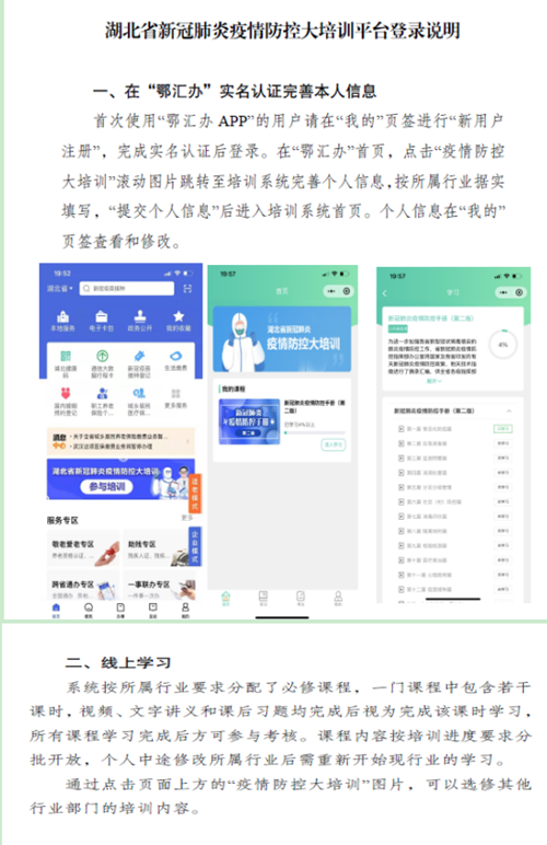 各级疫情防控机构和专兼职人员需下载“鄂汇办APP”,完成“新用户注册”,实名认证后登录。在“鄂汇办”首页,点击“疫情防控大培训”滚动图片跳转至培训系统完善个人信息,根据自己所属行业据实填写,系统按照不同行业需求自动分配必修课程,一门课程中包含若干课时,视频、文字讲义和课后习题均完成后视为完成该课时学习,所有课程学习完成后方可参与考核。经线上考核合格的参训人员可获得培训合格证明。