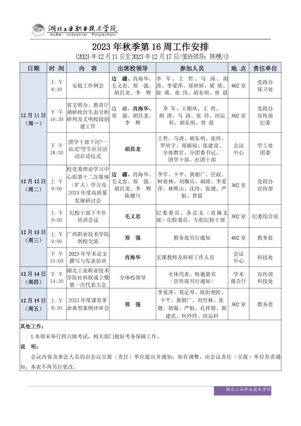 2023年秋季第16周工作安排